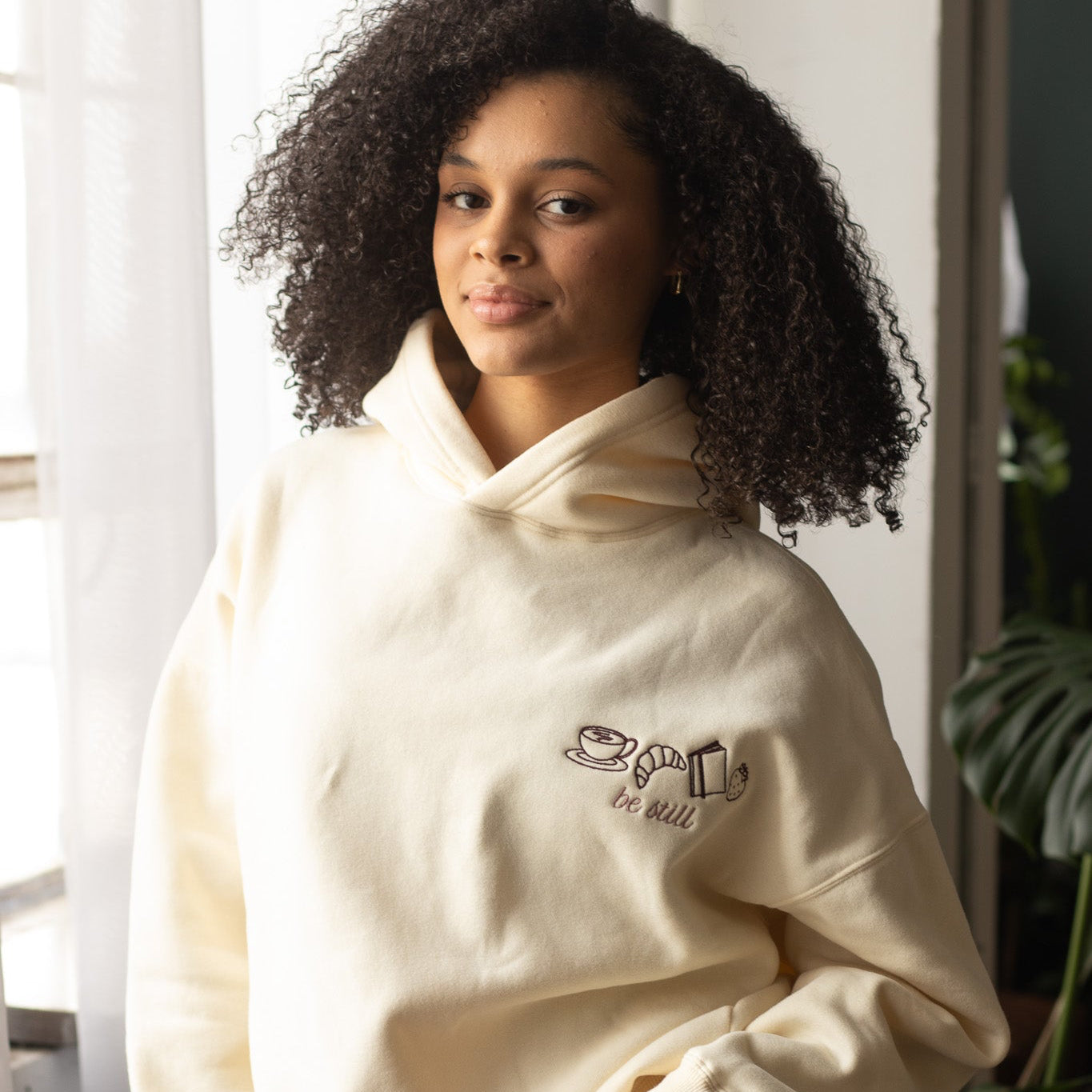 Snuggle up in this oversized fleece pullover hoodie featuring a fun collaboration between Kay Bentley's art and M. Anderson Design's embroidery.
