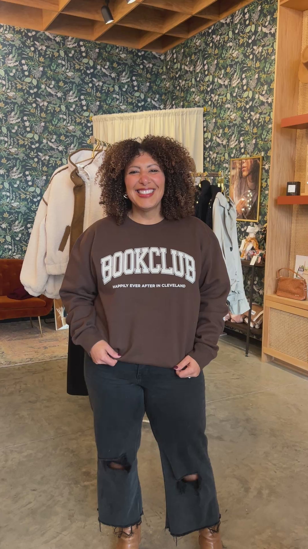 This chocolate brown sweatshirt from Independent Trading Company features a playful off-white "Bookclub -- Happily ever after in Cleveland" screen print, bringing cozy vibes with a fun twist.