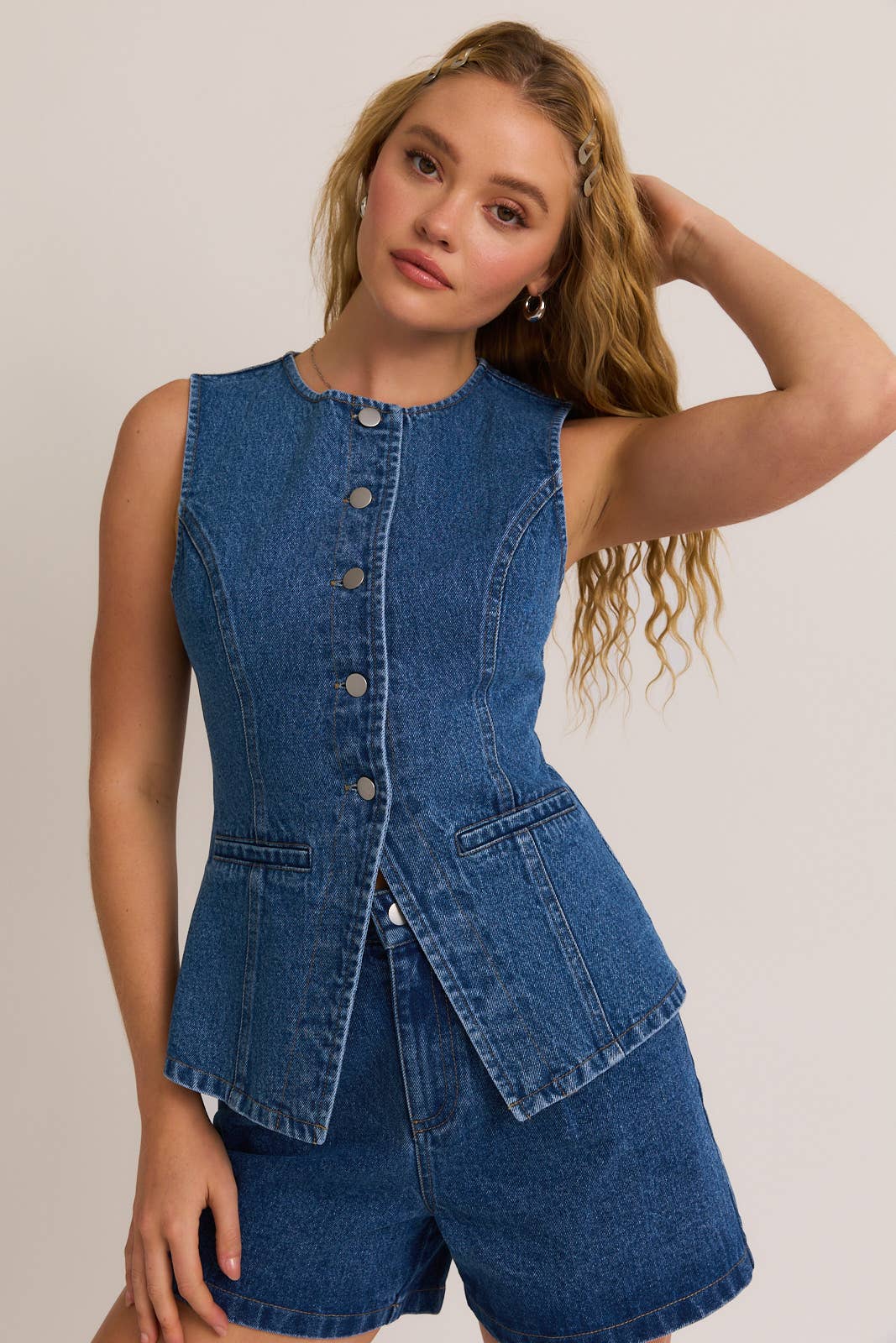 Rock this LE LIS - BUTTON FRONT SLEEVELESS DENIM TOP! Our petite model wears a size small and stands at 5'8", with a 32B bust, 24" waist, and 34" hips. Get funky fashion for spring and summer with this playful piece!