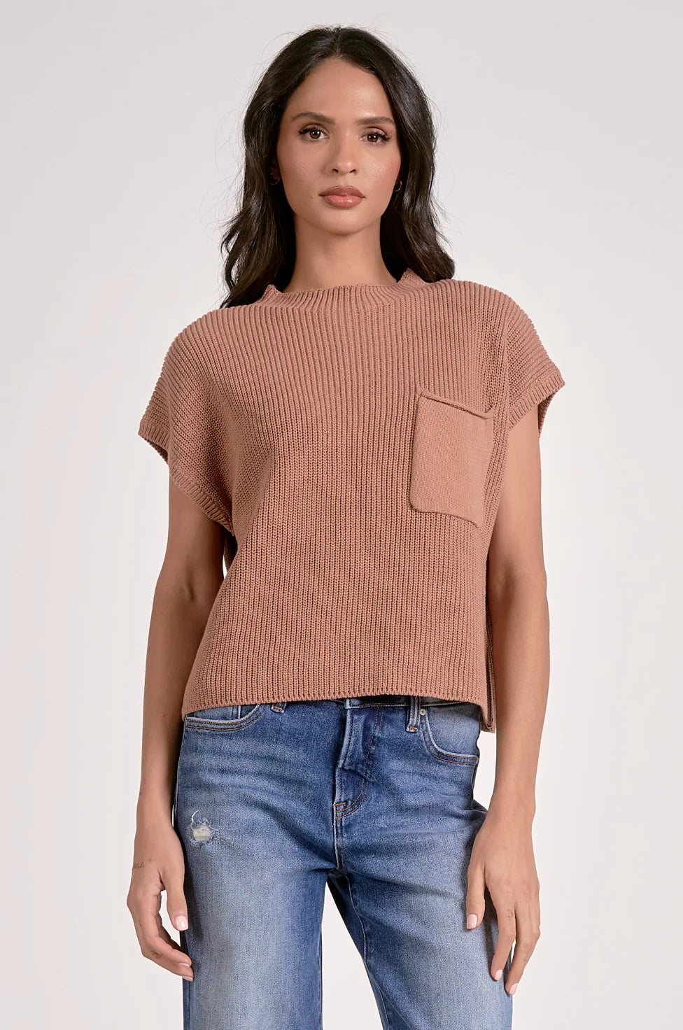 This mauve knit sweater with cap sleeves and a cute front pocket is your new go-to for effortless style and comfort. Its soft color and classic crew neck make it easy to wear and fun to love!