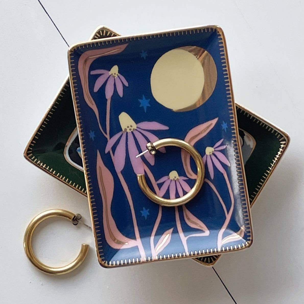 This ceramic trinket dish is a fan favorite gift, perfect for keeping on your nightstand or dresser. Made with white ceramic adorned with our playful hand-painted designs, and we even added a touch of flair with 10k gold detailing along the edge. Each dish comes in a plastic-free gift box, making it a pretty and easy gift to give without any wrapping necessary! • 3″ x 3″ Size • Ceramic with 10k Gold Detailing • Plastic-Free Packaging Included