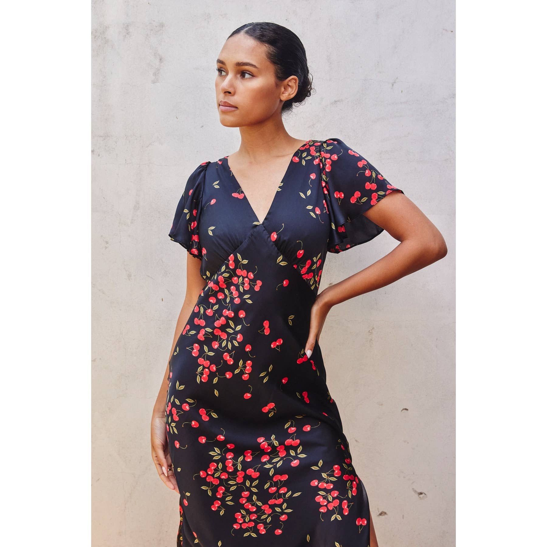 This cherry-print maxi dress features charming flutter sleeves and a flattering bust detail. Designed with a plunging neckline and chevron underbust accent, it offers a playful yet elegant look. The flowy skirt includes a left-side slit for added movement, while a hidden back zipper and elastic waist ensure a comfortable fit. Fully lined except for the sleeves, this dress is made from 100% polyester. Perfect for making a sweet statement wherever you go! Models are 5'8" and wear size Small.