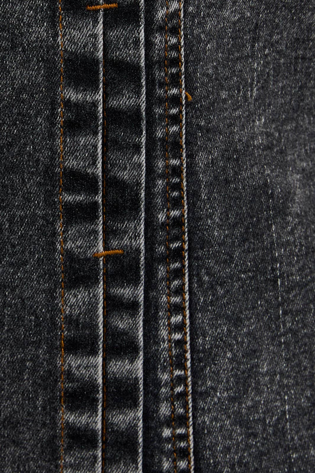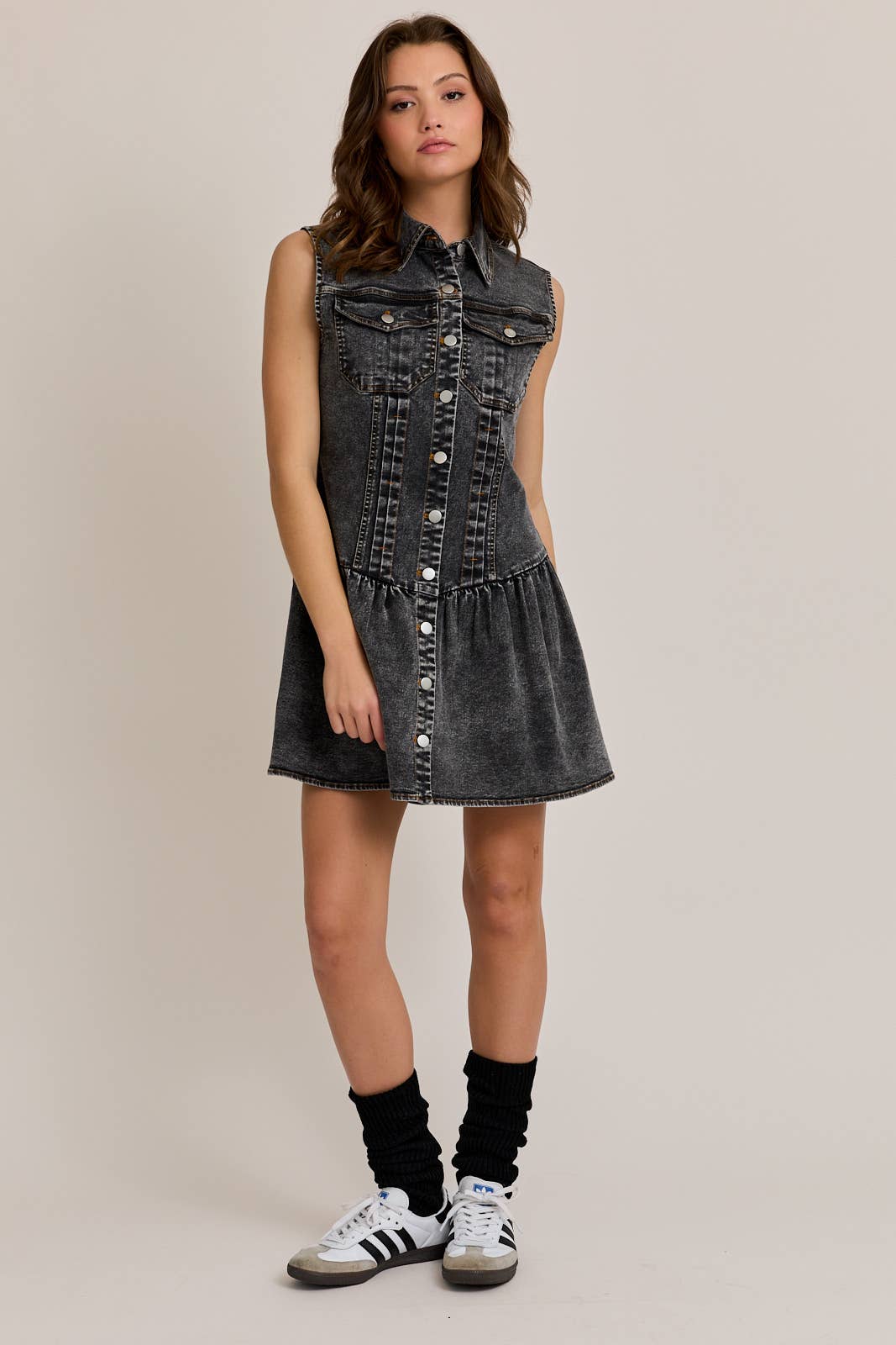 Get ready to look fab in this denim mini dress that's perfect for the warmer weather! The model is wearing a size small and her specs include a height of 5'8", bust of 32B, waist of 24", and hips of 34" - all in a chic black wash.