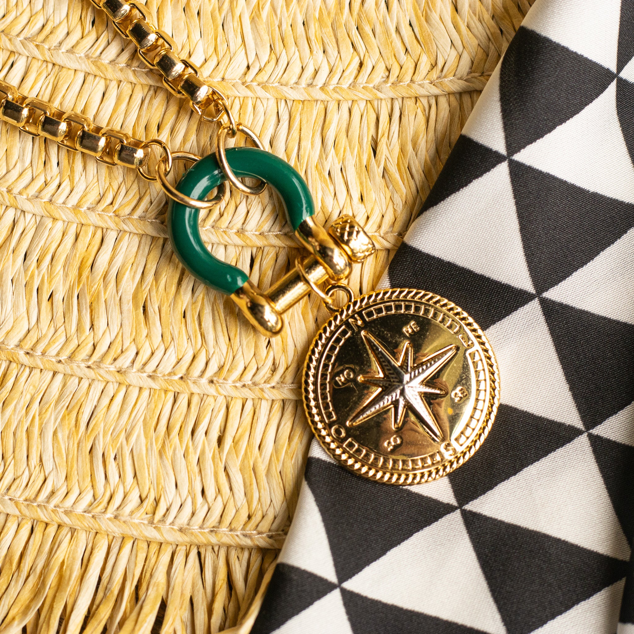 Elevate your stack with this attention grabbing chain. The Statement Box Chain features an oval connector and a compass charm with "Explore your world" on the back with either a green or gold-filled clasp.