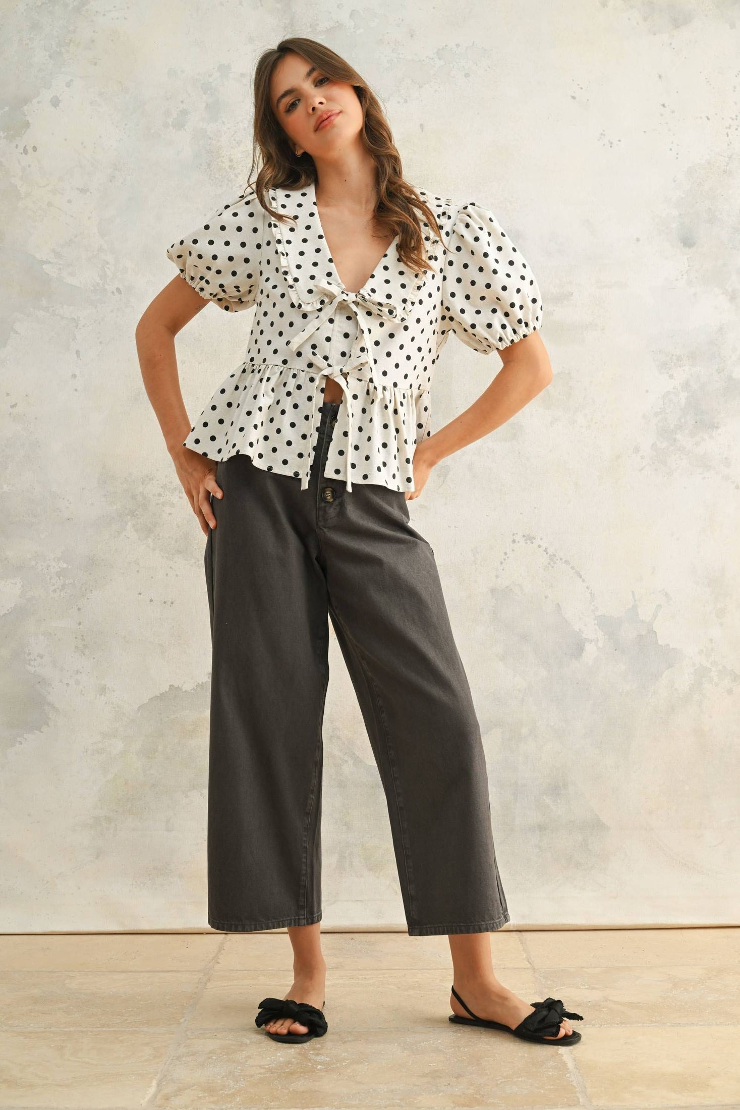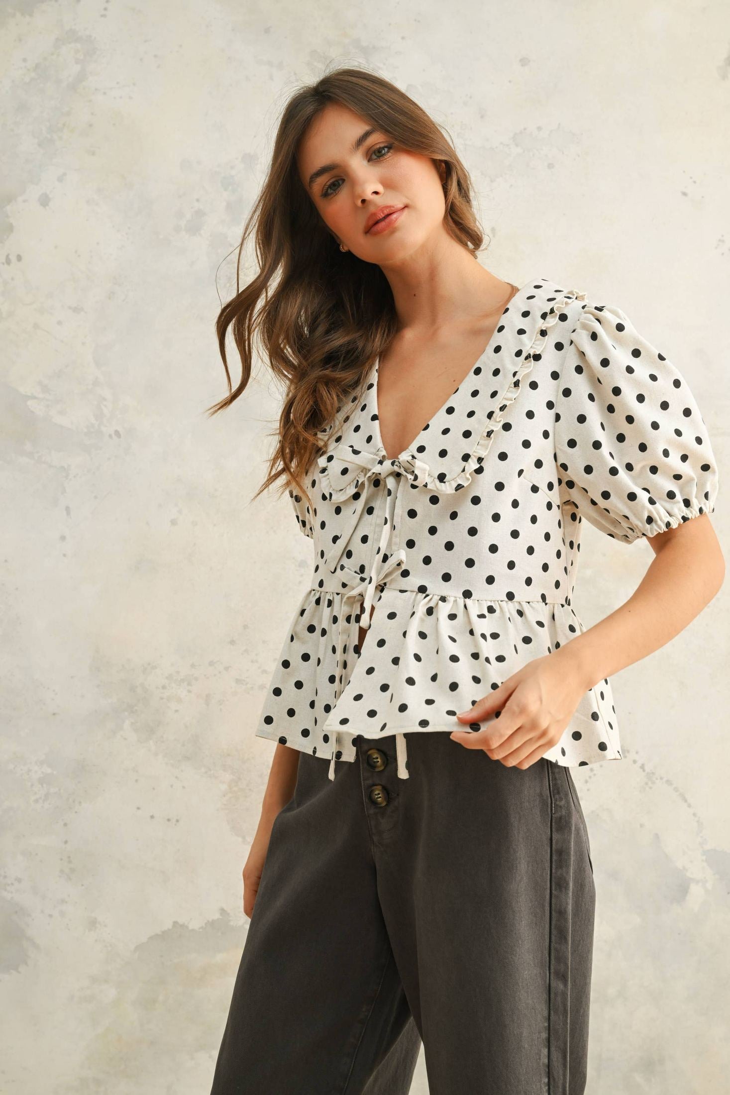 This LINEN BLOUSE is a must-have for any wardrobe, featuring a playful POLKA DOT PRINT. It's versatile enough to fit a variety of sizes, with measurements taken from the fabulous model who stands at 5' 7 1/2" /175.3CM and sports a 33(Bust) - 24(Waist) - 34(Hips) figure.