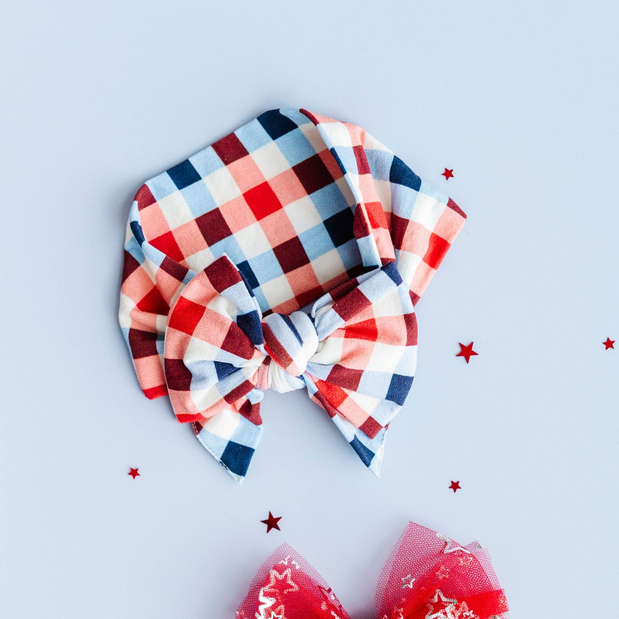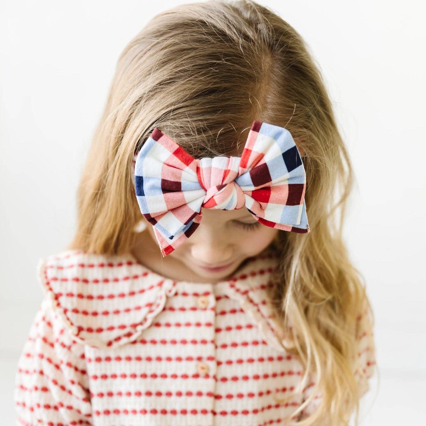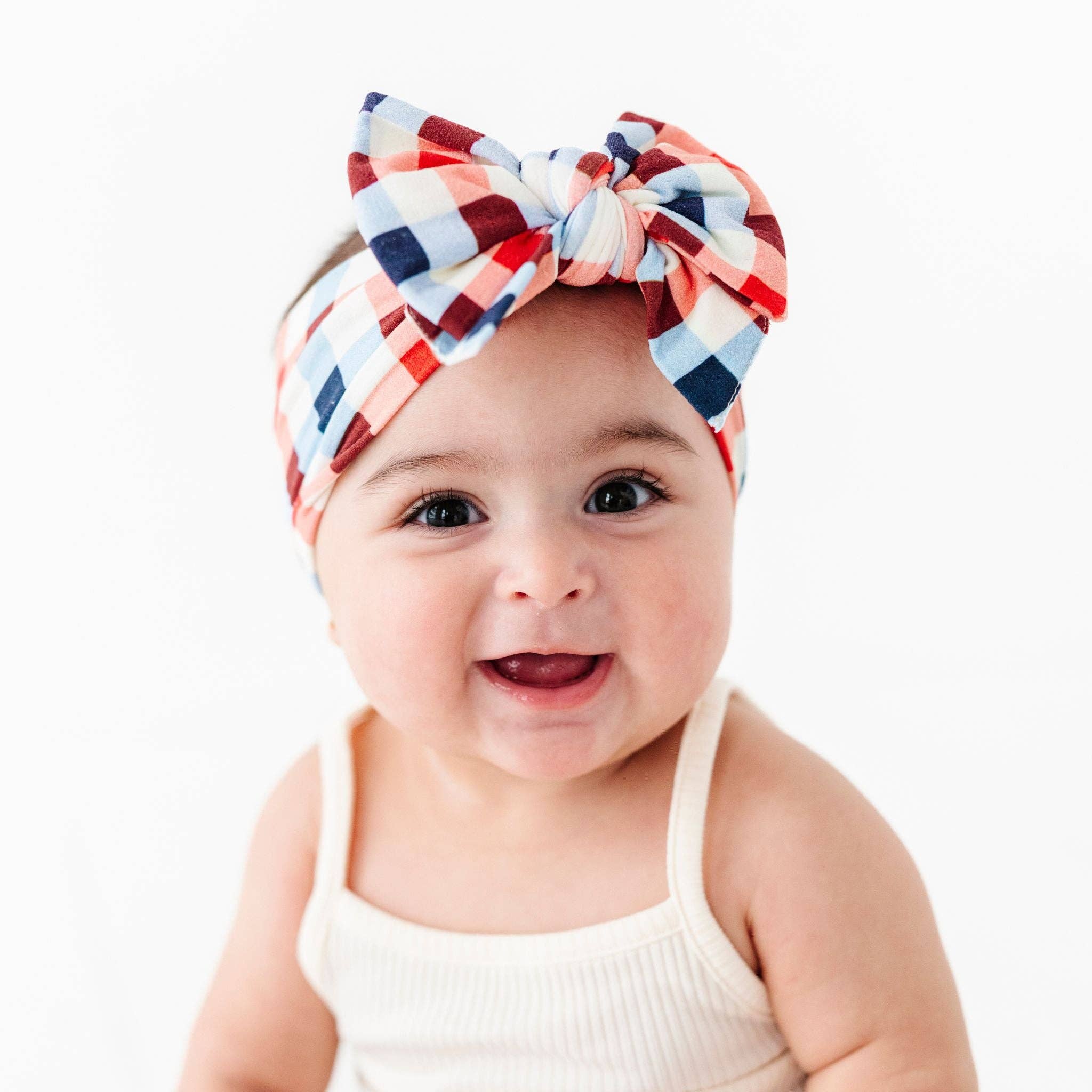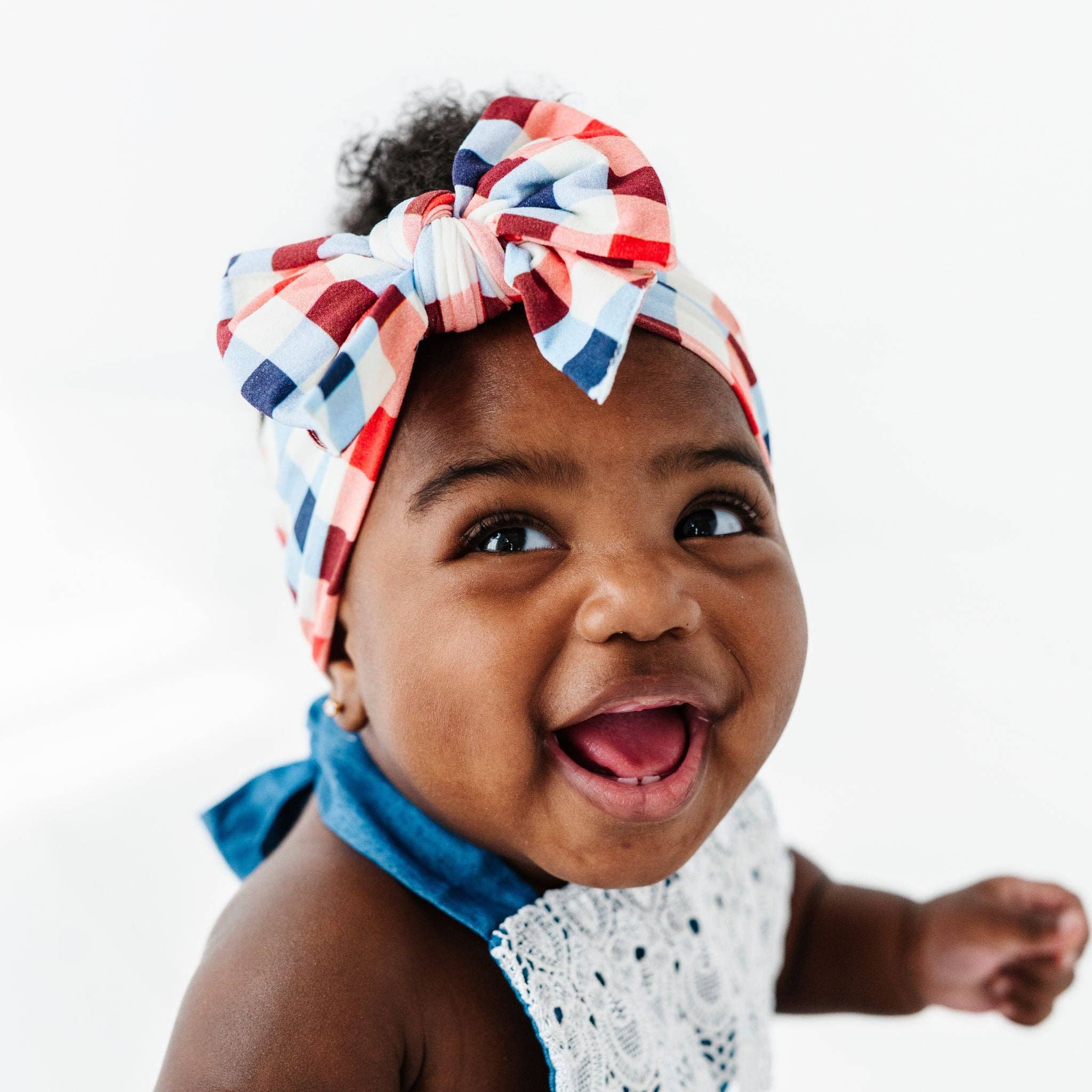 The PRINTED DEB (a.k.a Dang Enormous Bow) gets an extra boost of style with the seasons hottest prints! You'll be the main character of story time when you show up in this adorable headband. Enjoy ultimate comfort with our headband featuring minimal seams for maximum stretch. The classic bow shape with angled tails offers a sharp, tailored vibe. Detailed visible stitching not only adds charm but keeps the fabric intact—no holes cut here! Bright, bold prints bring a fun pop to any outfit, and floral patterns make mixing prints a breeze. These limited-edition designs won’t last long, so snag yours while they’re fresh! Each bow is perfectly secured with adhesive and lovingly hand sewn and tied by women in our local community.