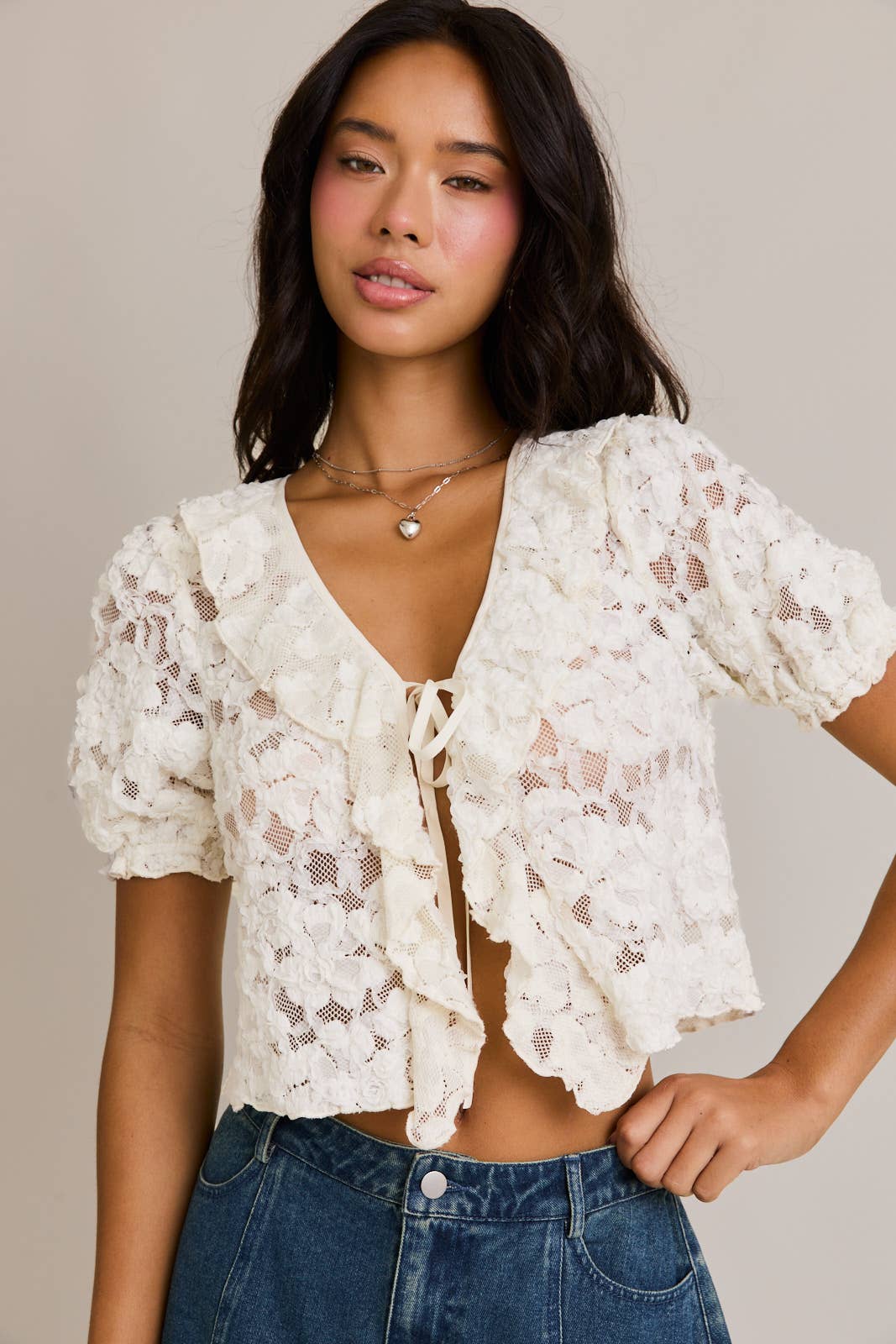 This top is perfect for spring, with a cute, white design that will have you feeling light and airy. Our model, standing at a height of 5'8" and sporting a size small, flaunts her 32B bust, 24" waist, and 34" hips.