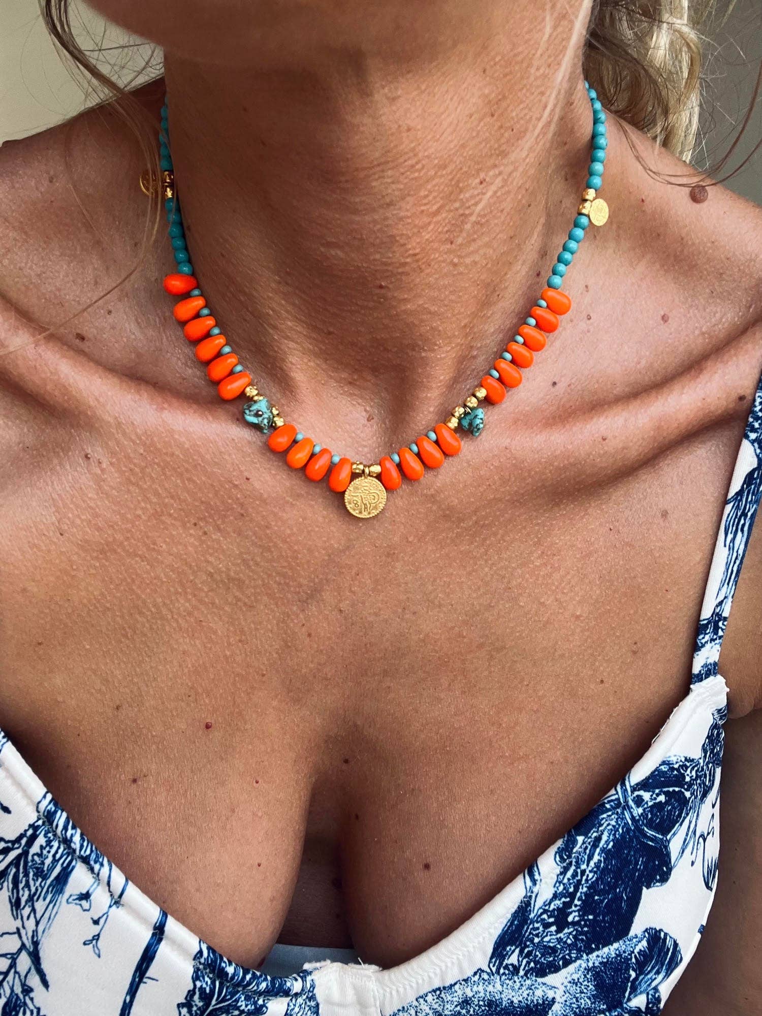 Bright Howlite beads meet shiny 24k gold-plated copper charms in this playful summer necklace. Featuring a steel chain adjustable from 36cm, it’s a sunny accessory crafted with love in Greece.